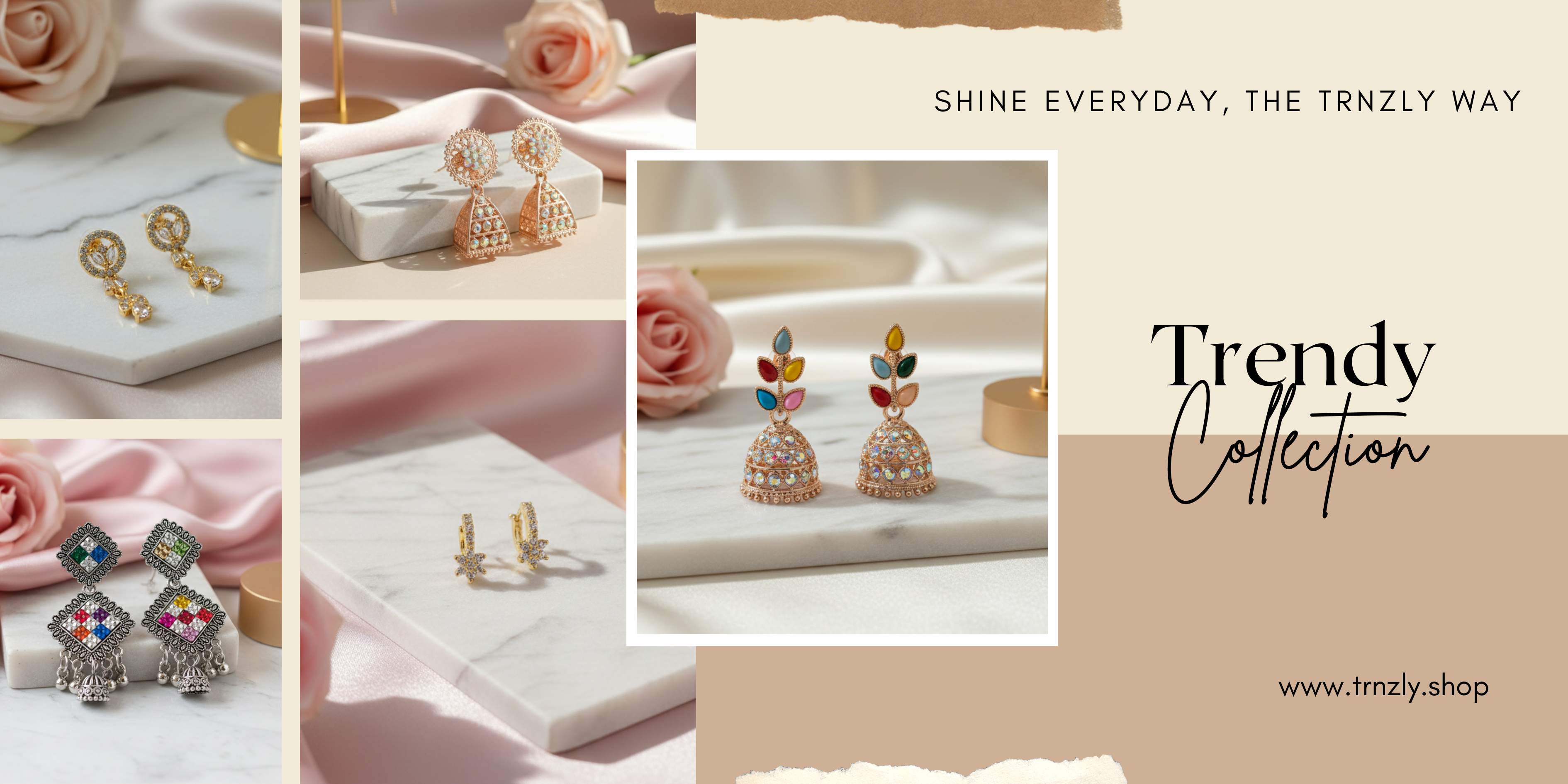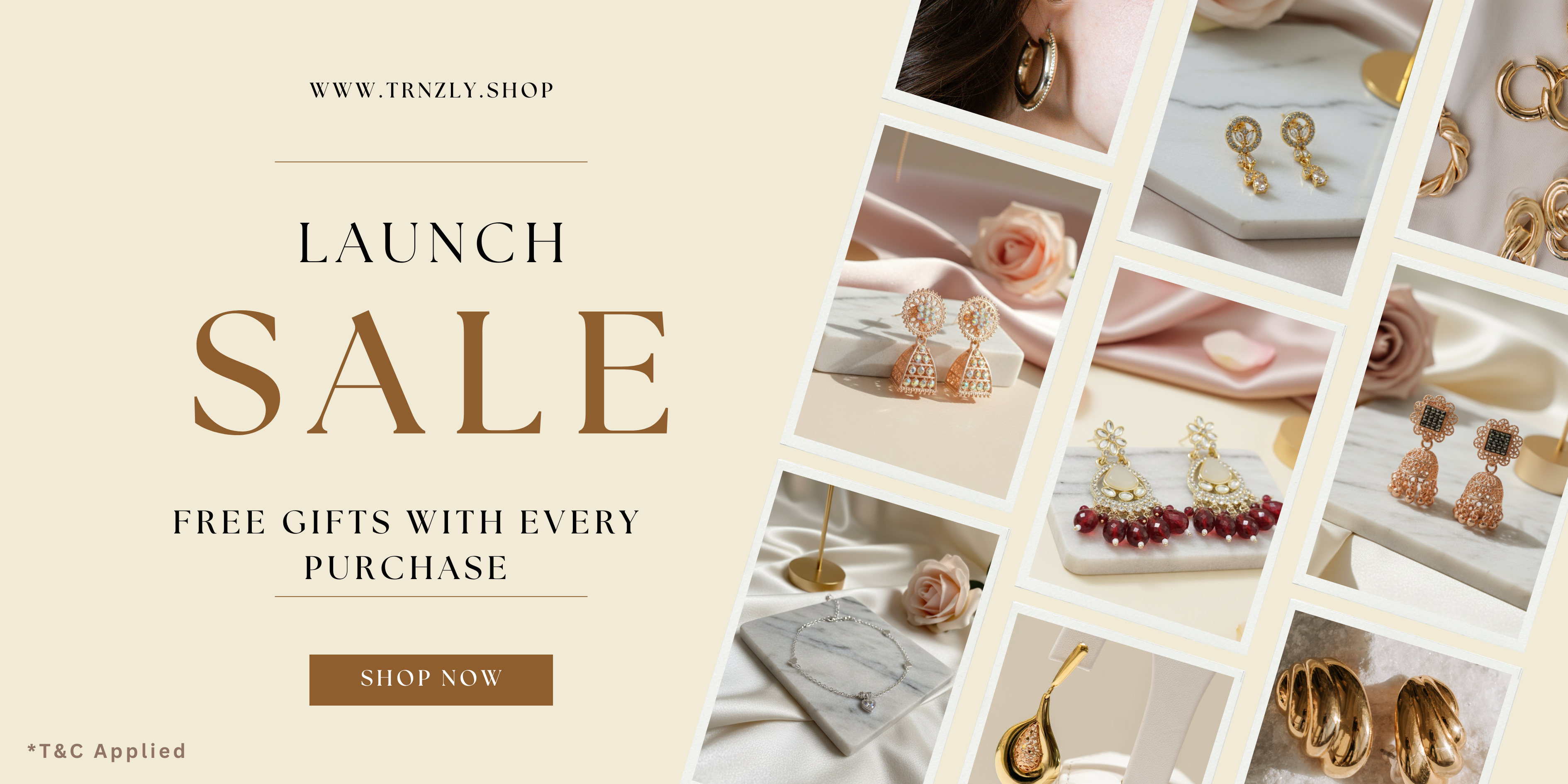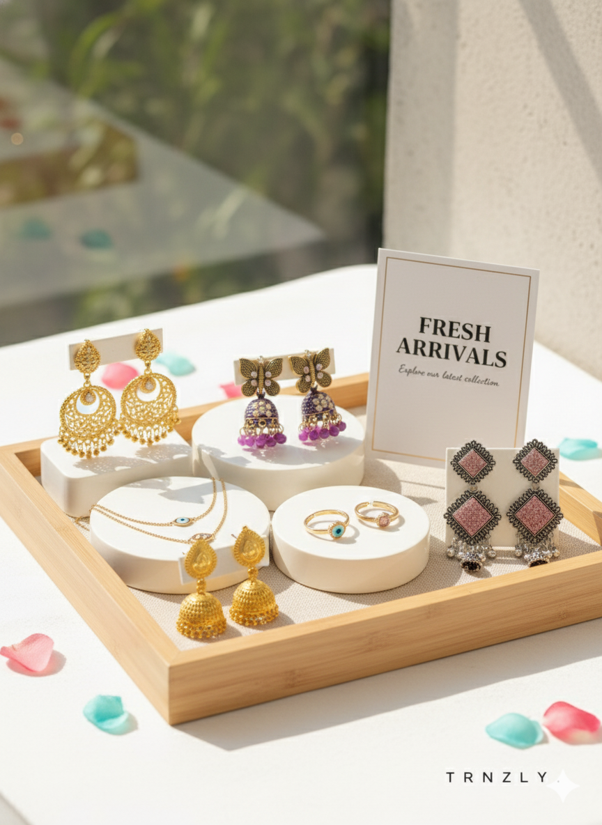 TRNZLY offers a wide range of artificial and imitation jewellery, including earrings, jhumkas, necklaces, rings, bangles, anklets, kadas, and gift combos. We also offer handcrafted bags, clutches, purses, and perfumes.